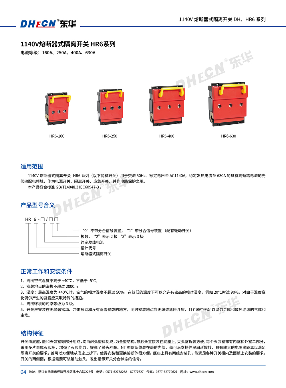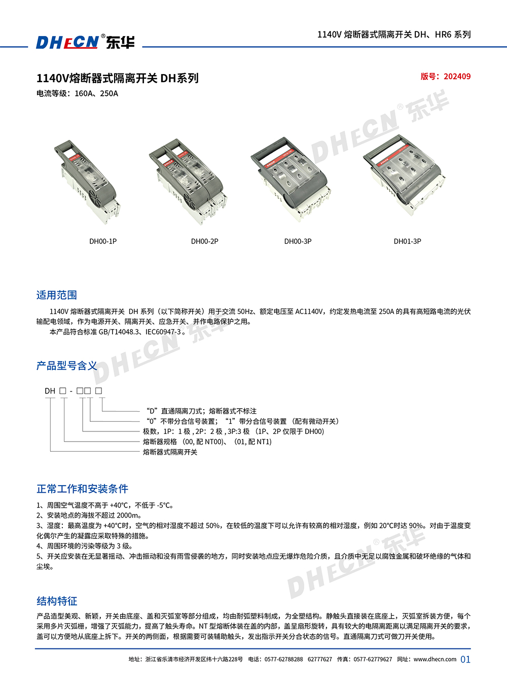 DH系列熔斷器式隔商開關(guān)(以下簡(jiǎn)稱開關(guān))適用于交流 50Hz,額定電壓至 1140V、約定發(fā)熱電流至 250A 的具有高短路電流的配電電路和電動(dòng)機(jī)電路中,作為電源開關(guān)、隔離開關(guān)、應(yīng)急開關(guān)、并作電路保護(hù)之用、但一般不作為直接開閉單臺(tái)電動(dòng)機(jī)之用。亦可做刀開關(guān)使用。本產(chǎn)品符合標(biāo)準(zhǔn) GBT14048.3IEC60947-3.